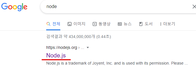 먼저, 구글 창에 Node.js를 검색하여 제일 먼저 뜨는 공식 홈페이지에 접속한다.