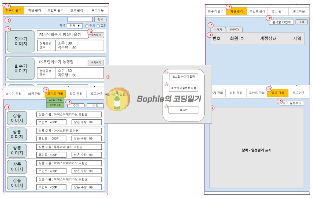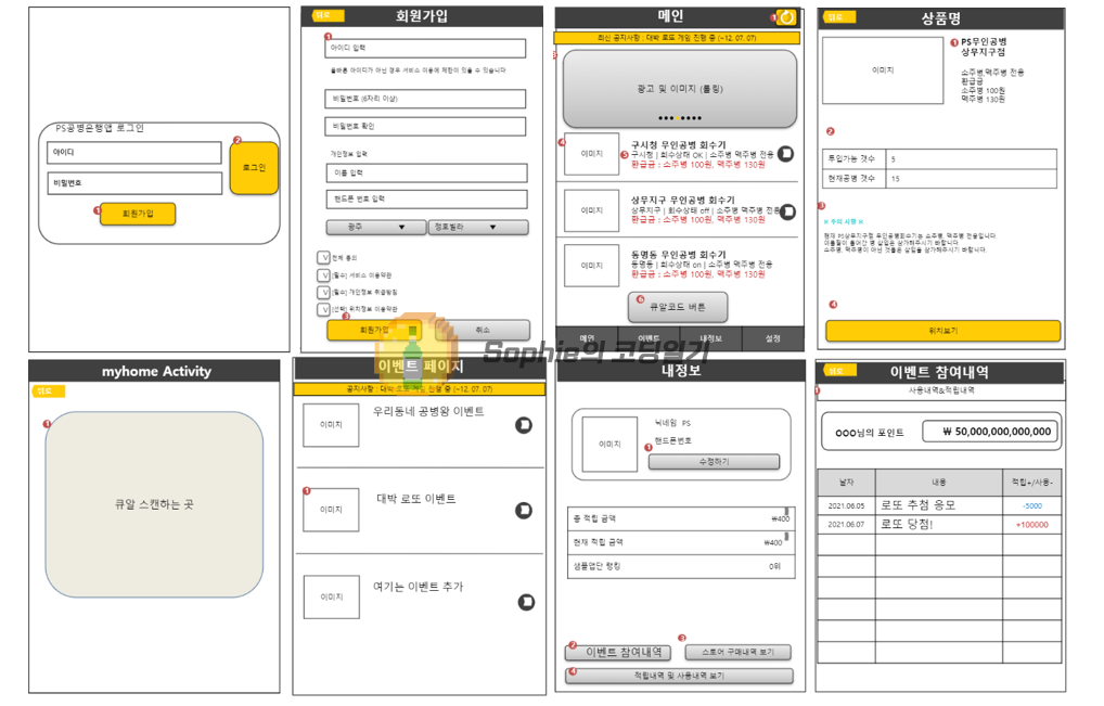 각각의 페이지들은 스토리보드를 통해 각 화면 구성과 기능을 정의하였습니다.