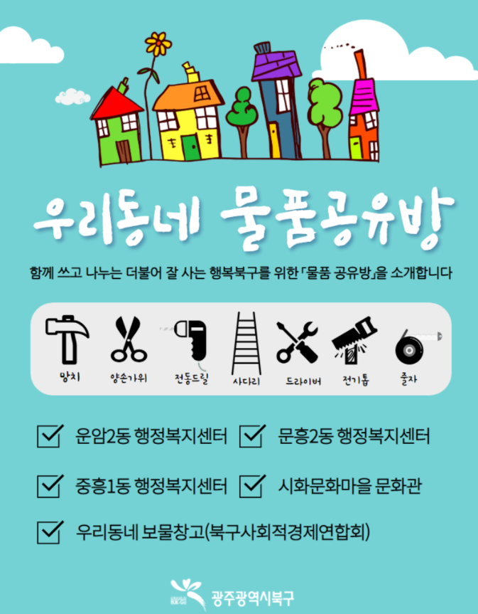 광주 북구 주민센터에서 생활공구를 대여해주는 '우리동네 물품 공유방' 이라는 좋은 시스템을 운영하고 있더라구요!!