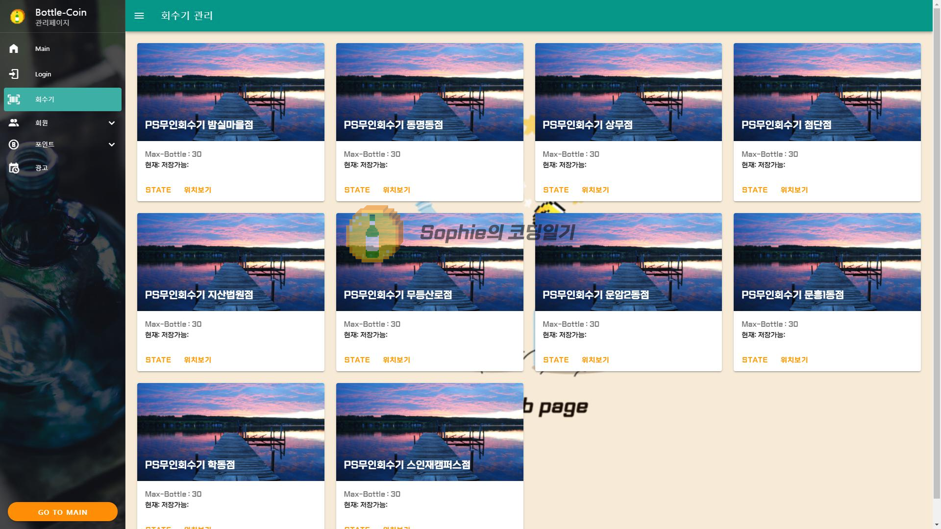 사실 여기에 회수기 이미지가 들어가야하지만... 이때 하드웨어 외형이 다 나오지 않았던 터라 임시로 이미지를 넣어둔 거에요! 또한 각 회수기별로 클릭시에 위치를 볼 수 있게 API를 활용하여 넣었습니다!