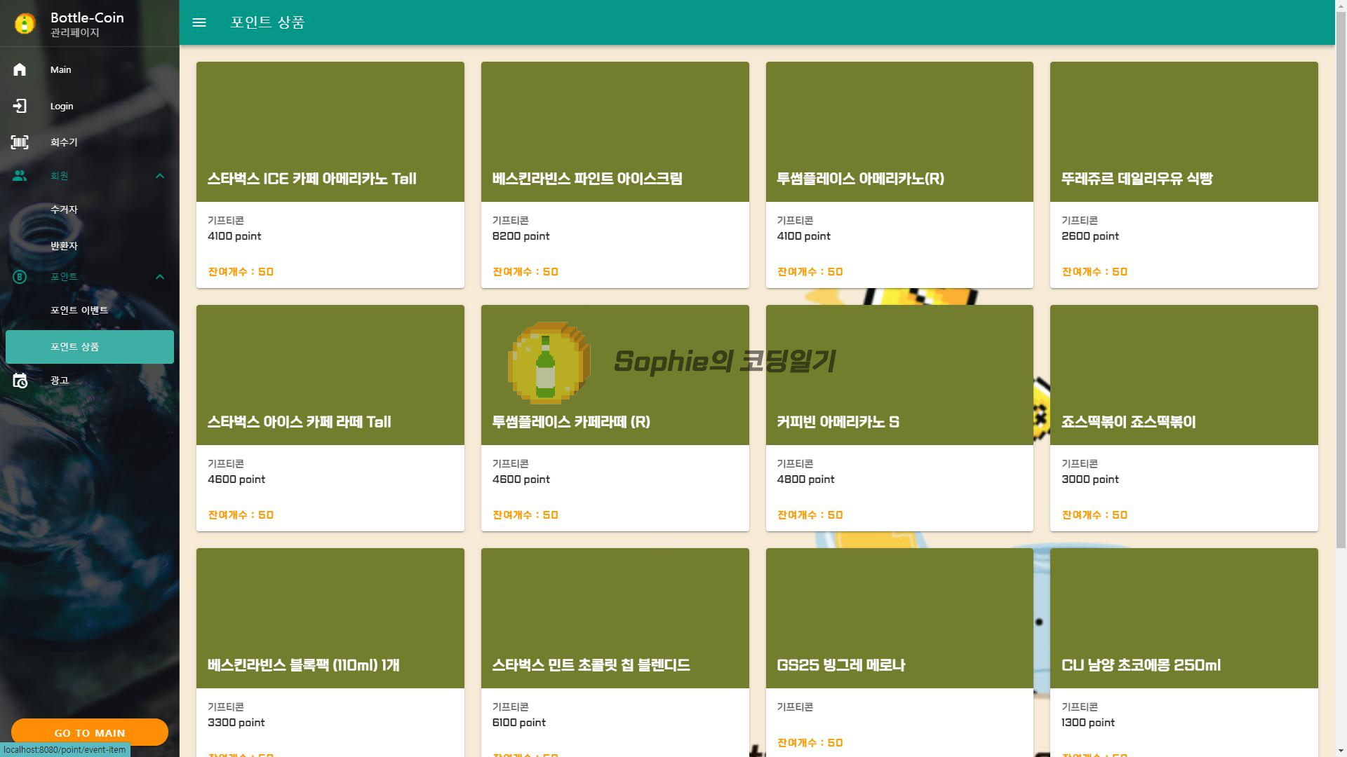 이벤트 상품 페이지는 포인트를 상품으로 교환하는 시스템이 있기 때문에 그 상품들을 관리할 수 있는 재고관리 시스템 형식의 페이지 입니다.